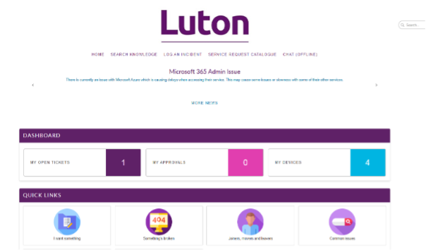 - Launched our very own branded Luton Self-Service Portal where users can report and view incidents, submit requests from a range of service catalogue items, find FAQs, and chat to an analyst.