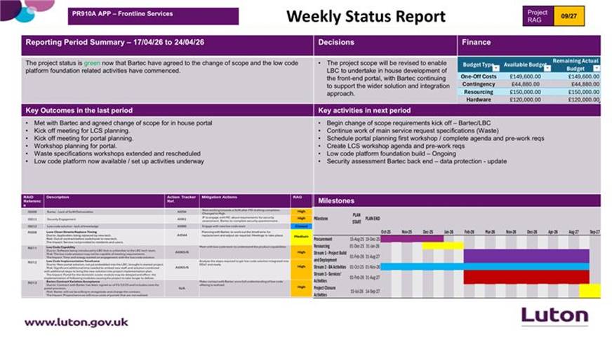 The project status is green now that Bartec have agreed to the change of scope and the low code platform foundation related activities have commenced.